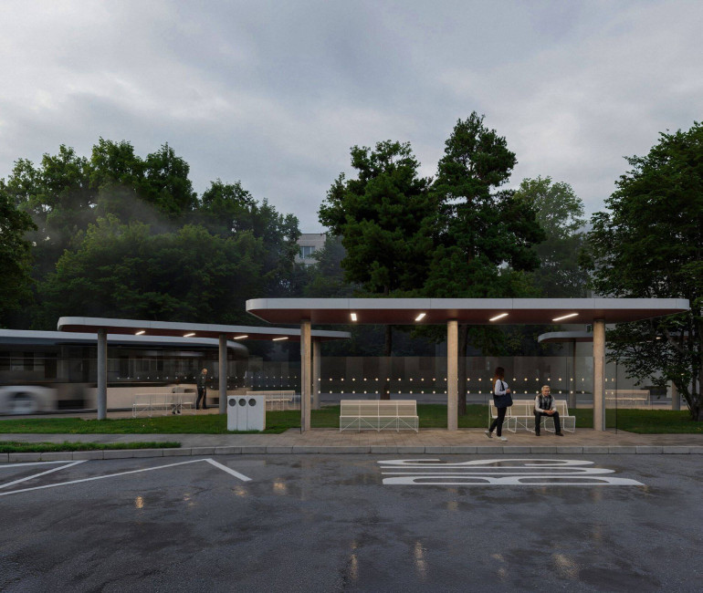 Výrazná strecha chráni cestujúcich a dáva stavbe jasnú identitu. Jedná sa o silný koncept, druhé miesto získava najmä kvôli radikálnosti, ktorá však môže byť realizačne náročnejšia. Architektonický výraz – dominantná horizontála zastrešenia chráni cestujúcich a dáva stavbe jasnú identitu; pavilóny sú rozmiestnené v rytme, ktorý zlepšuje priehľadnosť a pohyb. Návrh je architektonicky aj funkčne kvalitný, no s menšou možnosťou budúcich úprav.