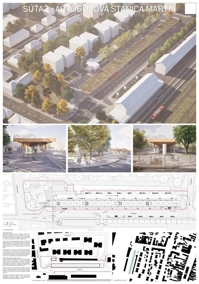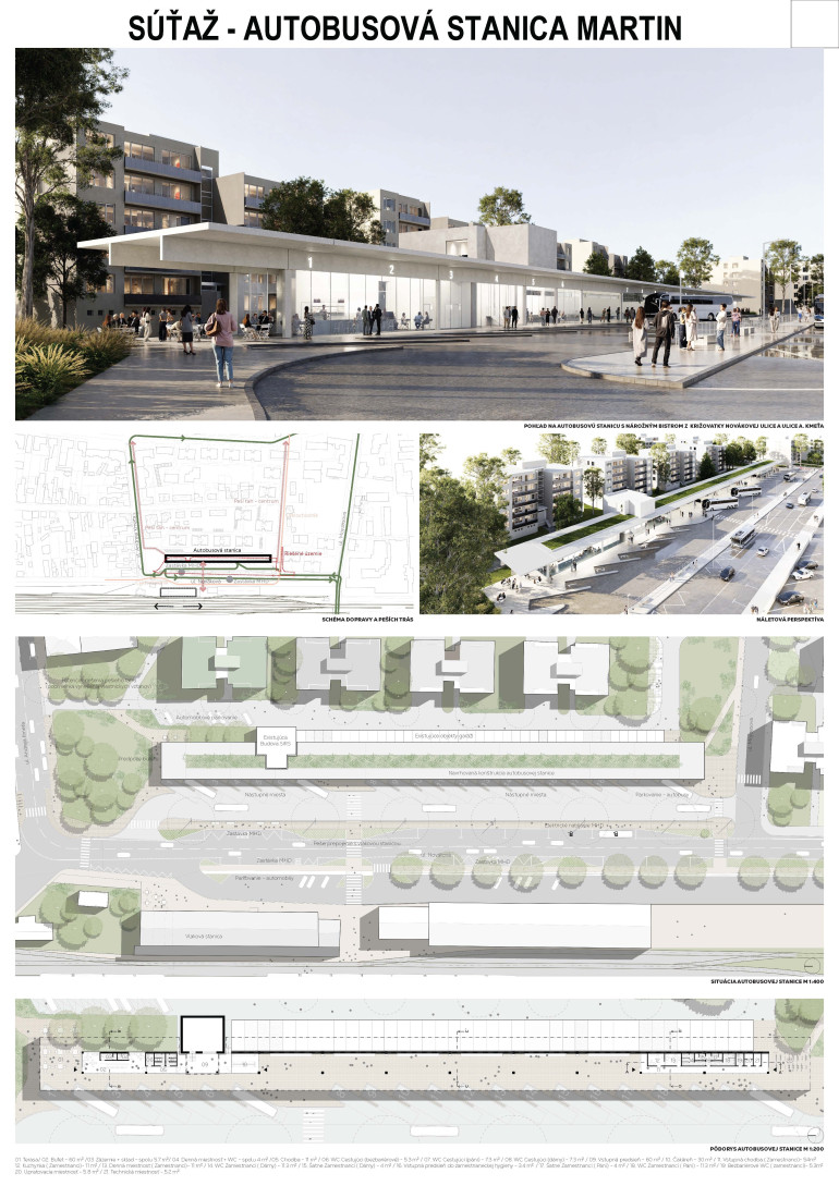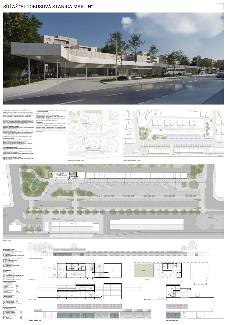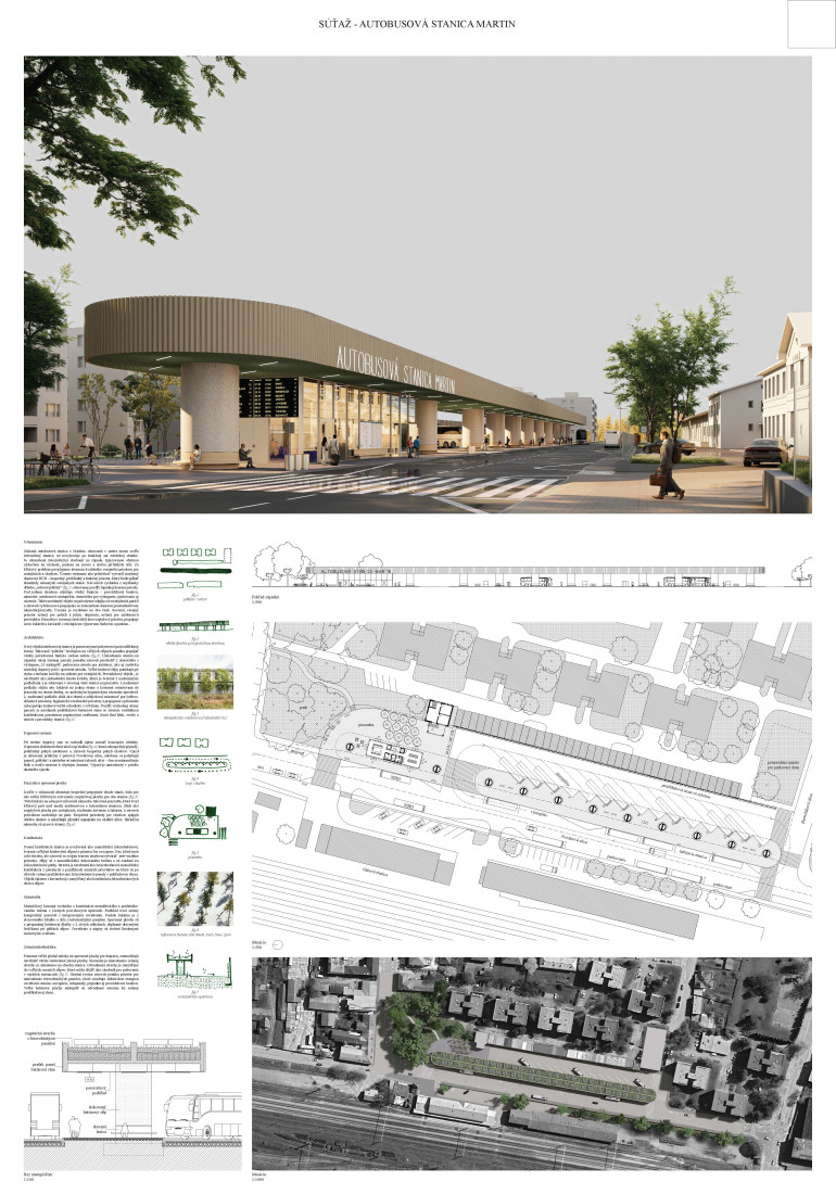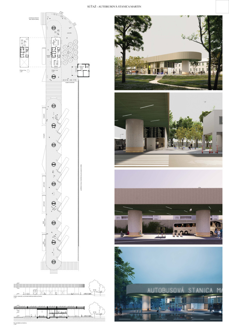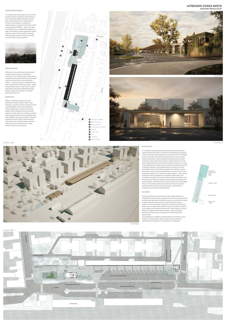 Návrh sa vyznačuje výrazne horizontálnym architektonickým výrazom, ktorý citlivo reaguje na mierku a charakter okolitej zástavby. V urbanistickom kontexte nepôsobí dominantne, ale prirodzene dopĺňa existujúcu štruktúru územia, čím podporuje jeho čitateľnosť a priestorovú kontinuitu. Prináša premyslenú dopravnú koncepciu s plynulou a bezpečnou prevádzkou pričom urbanisticky sprehľadňuje územie. Autobusová stanica je riešená ako centrálny ostrov s nástupišťami a pavilónmi, ktoré umožňujú dobrú orientáciu cestujúcich. V rámci dispozičného riešenia sú všetky hlavné funkcie – prevádzkové priestory pre vodičov diaľkových liniek, obchodný priestor - kaviareň aj čakáreň - situované v samostatných pozdĺžnych "pavilónoch", organizovaných pod jednou strechou na úrovni prízemia, pričom zostáva zachovaná možnosť priečneho aj pozdĺžneho pohybu peších. Na druhej strane obslužné priestory pre čakáreň a kaviareň sú príliš atomizované (rozptýlené), pričom ich proporcie komplikujú praktické využitie v reálnej prevádzke. Táto atomizácia má priamy negatívny dopad na stavebné náklady. Hoci lineárna kompozícia nástupíšť pôsobí esteticky, prevádzková réžia takto rozdrobeného zázemia je pre správcu menej efektívna. Figúra stanice s lightboxami a nápisom „MARTIN“ je kvalitná, no nepreváži funkčné limity úzkych vnútorných priestorov.