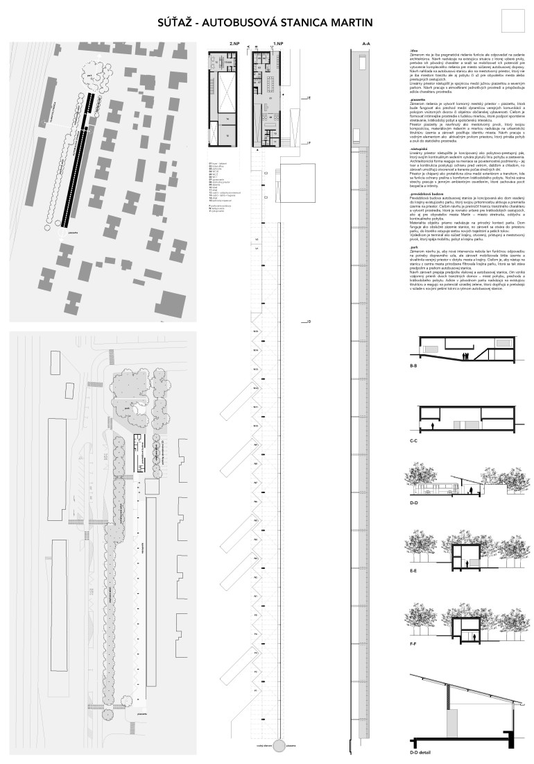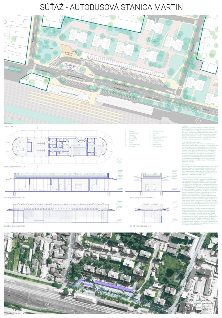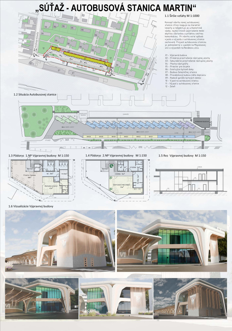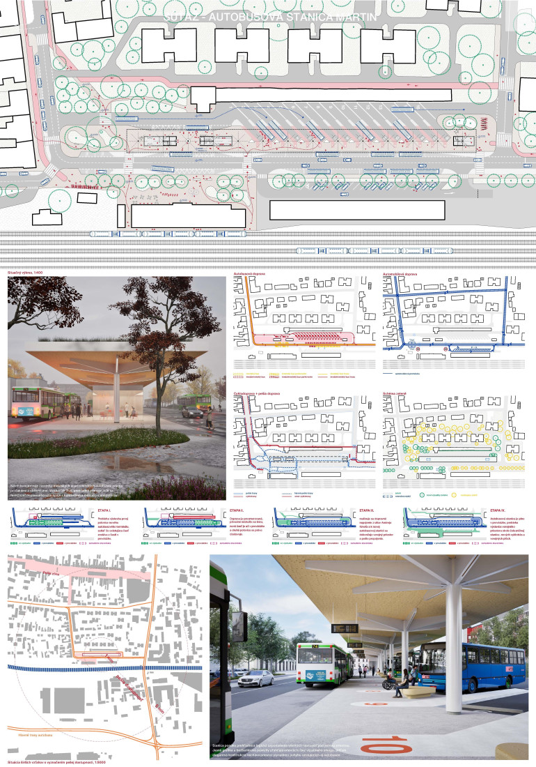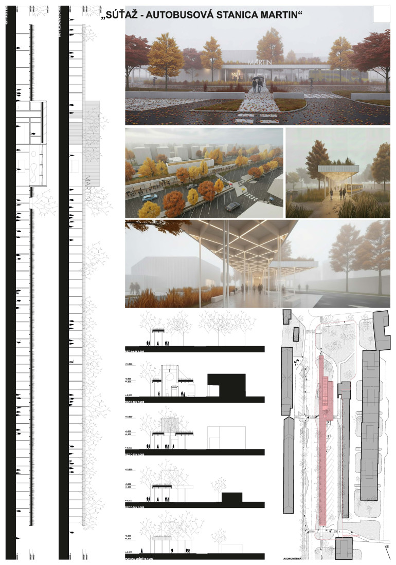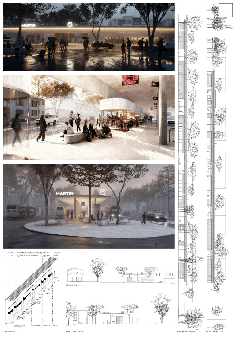 Návrh sa vyznačuje výrazne horizontálnym architektonickým výrazom, ktorý citlivo reaguje na mierku a charakter okolitej zástavby. V urbanistickom kontexte nepôsobí dominantne, ale prirodzene dopĺňa existujúcu štruktúru územia, čím podporuje jeho čitateľnosť a priestorovú kontinuitu. Prináša premyslenú dopravnú koncepciu s plynulou a bezpečnou prevádzkou pričom urbanisticky sprehľadňuje územie. Autobusová stanica je riešená ako centrálny ostrov s nástupišťami a pavilónmi, ktoré umožňujú dobrú orientáciu cestujúcich. V rámci dispozičného riešenia sú všetky hlavné funkcie – prevádzkové priestory pre vodičov diaľkových liniek, obchodný priestor - kaviareň aj čakáreň - situované v samostatných pozdĺžnych "pavilónoch", organizovaných pod jednou strechou na úrovni prízemia, pričom zostáva zachovaná možnosť priečneho aj pozdĺžneho pohybu peších. Na druhej strane obslužné priestory pre čakáreň a kaviareň sú príliš atomizované (rozptýlené), pričom ich proporcie komplikujú praktické využitie v reálnej prevádzke. Táto atomizácia má priamy negatívny dopad na stavebné náklady. Hoci lineárna kompozícia nástupíšť pôsobí esteticky, prevádzková réžia takto rozdrobeného zázemia je pre správcu menej efektívna. Figúra stanice s lightboxami a nápisom „MARTIN“ je kvalitná, no nepreváži funkčné limity úzkych vnútorných priestorov.