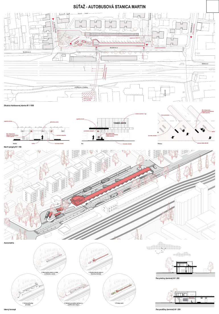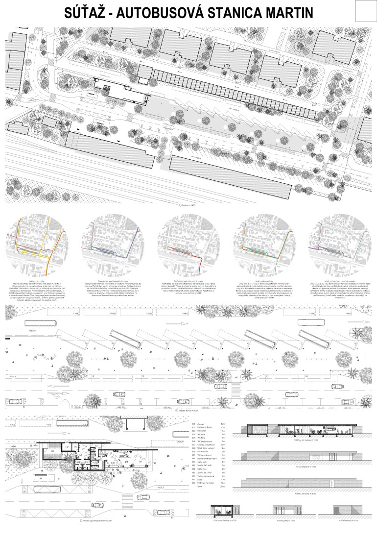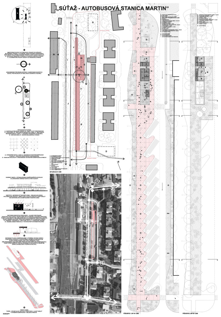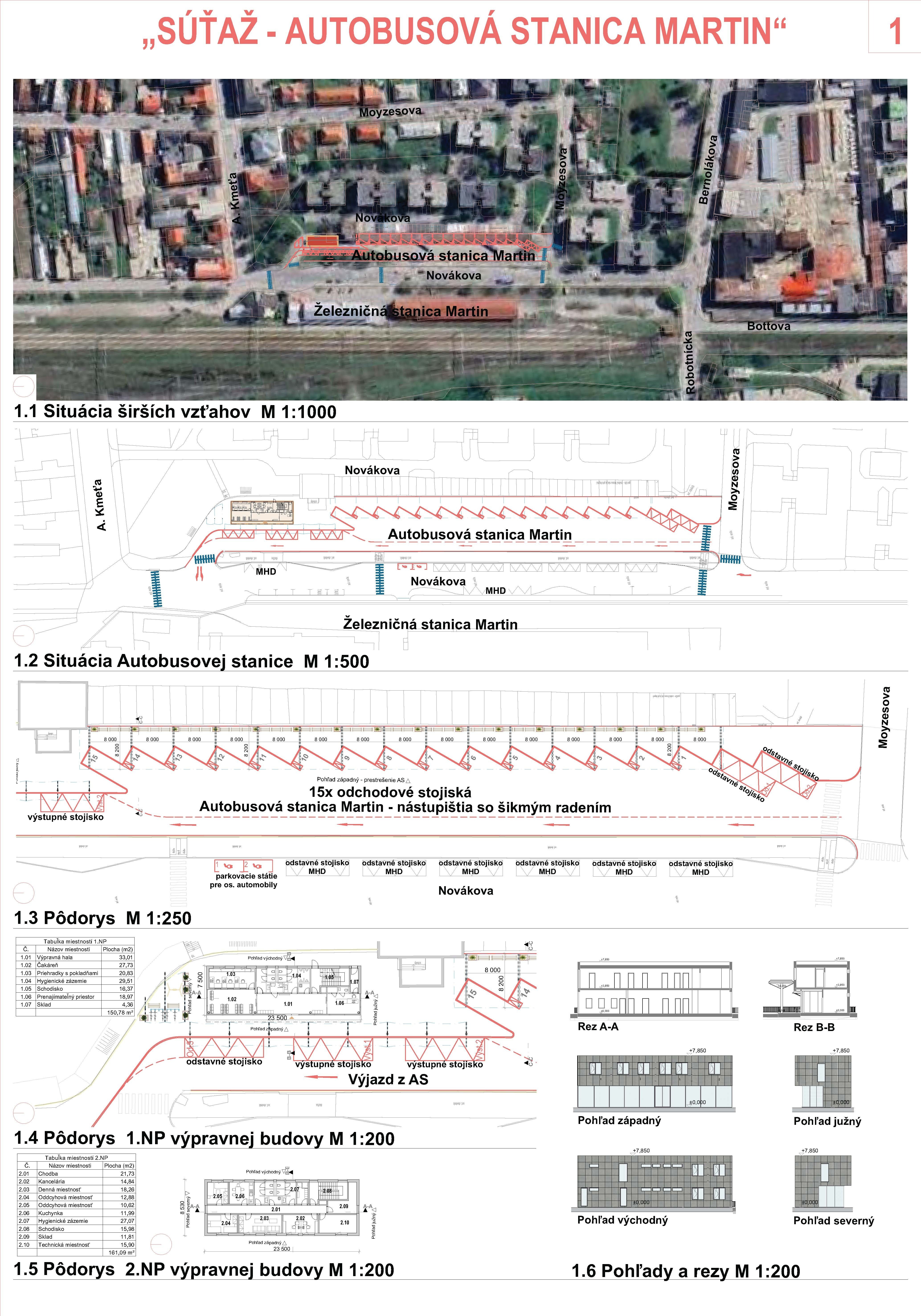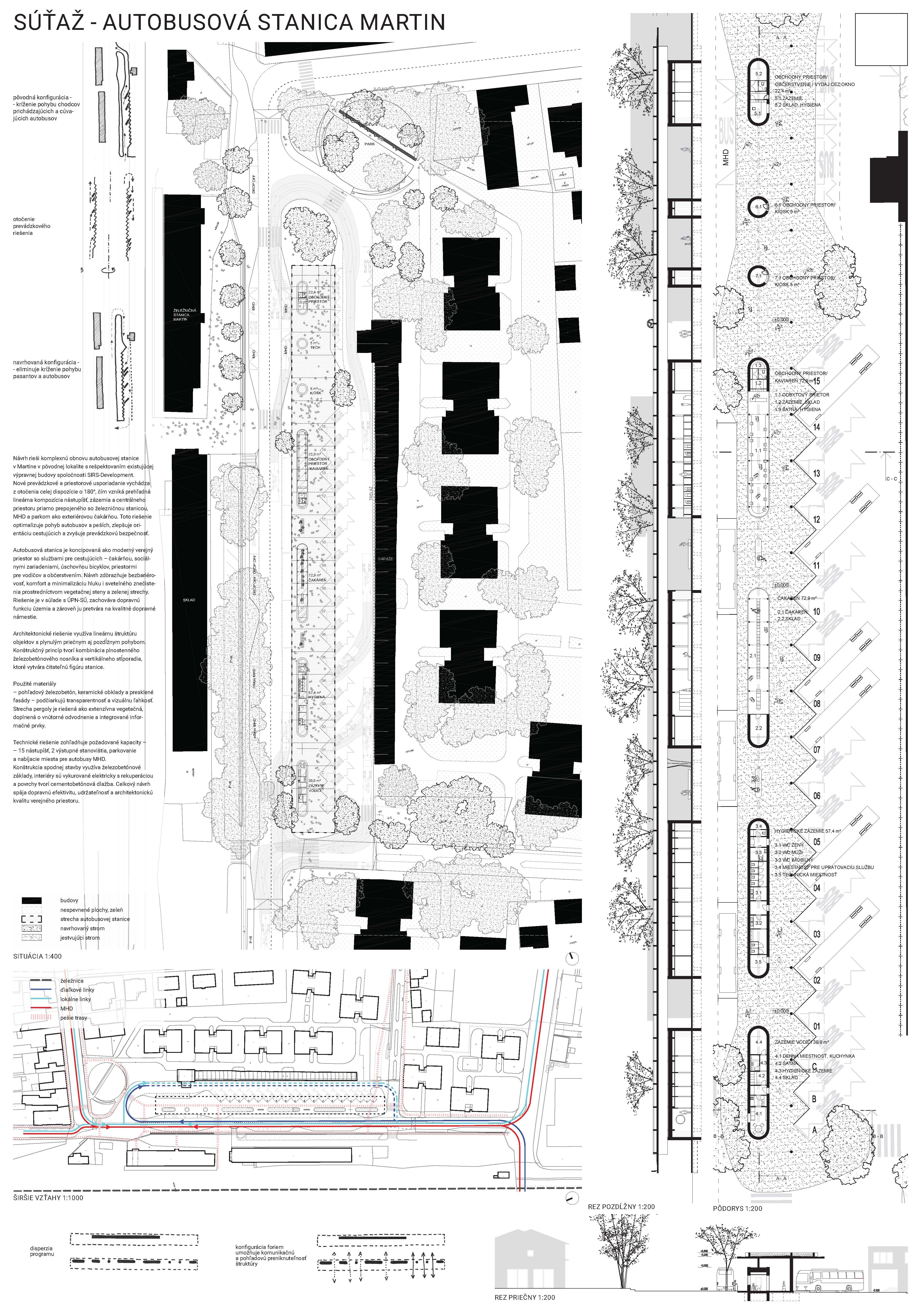 Návrh sa vyznačuje výrazne horizontálnym architektonickým výrazom, ktorý citlivo reaguje na mierku a charakter okolitej zástavby. V urbanistickom kontexte nepôsobí dominantne, ale prirodzene dopĺňa existujúcu štruktúru územia, čím podporuje jeho čitateľnosť a priestorovú kontinuitu. Prináša premyslenú dopravnú koncepciu s plynulou a bezpečnou prevádzkou pričom urbanisticky sprehľadňuje územie. Autobusová stanica je riešená ako centrálny ostrov s nástupišťami a pavilónmi, ktoré umožňujú dobrú orientáciu cestujúcich. V rámci dispozičného riešenia sú všetky hlavné funkcie – prevádzkové priestory pre vodičov diaľkových liniek, obchodný priestor - kaviareň aj čakáreň - situované v samostatných pozdĺžnych "pavilónoch", organizovaných pod jednou strechou na úrovni prízemia, pričom zostáva zachovaná možnosť priečneho aj pozdĺžneho pohybu peších. Na druhej strane obslužné priestory pre čakáreň a kaviareň sú príliš atomizované (rozptýlené), pričom ich proporcie komplikujú praktické využitie v reálnej prevádzke. Táto atomizácia má priamy negatívny dopad na stavebné náklady. Hoci lineárna kompozícia nástupíšť pôsobí esteticky, prevádzková réžia takto rozdrobeného zázemia je pre správcu menej efektívna. Figúra stanice s lightboxami a nápisom „MARTIN“ je kvalitná, no nepreváži funkčné limity úzkych vnútorných priestorov.