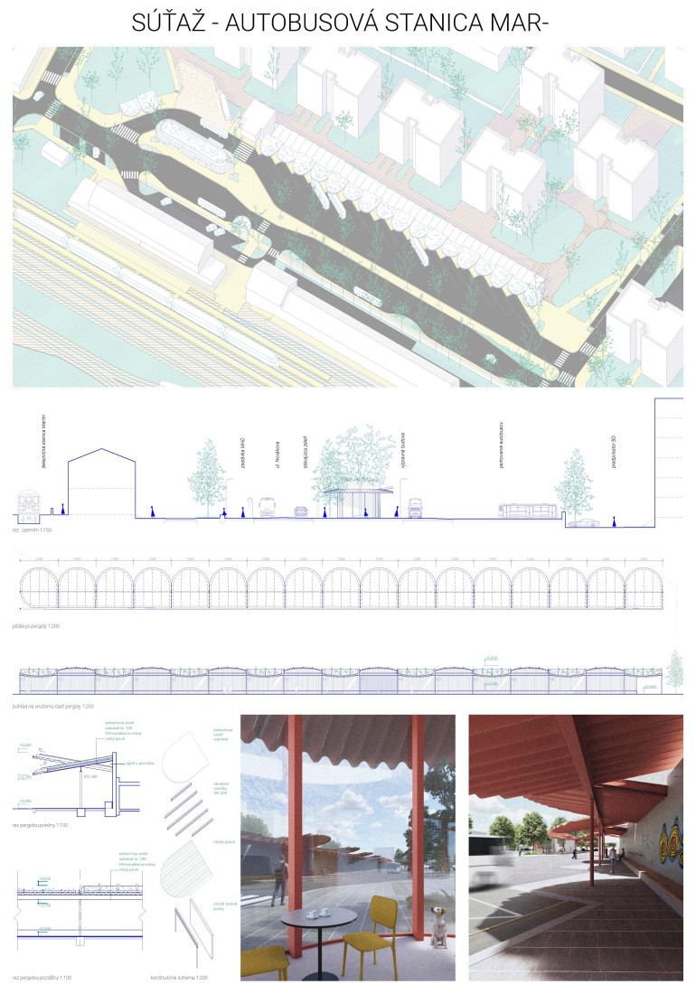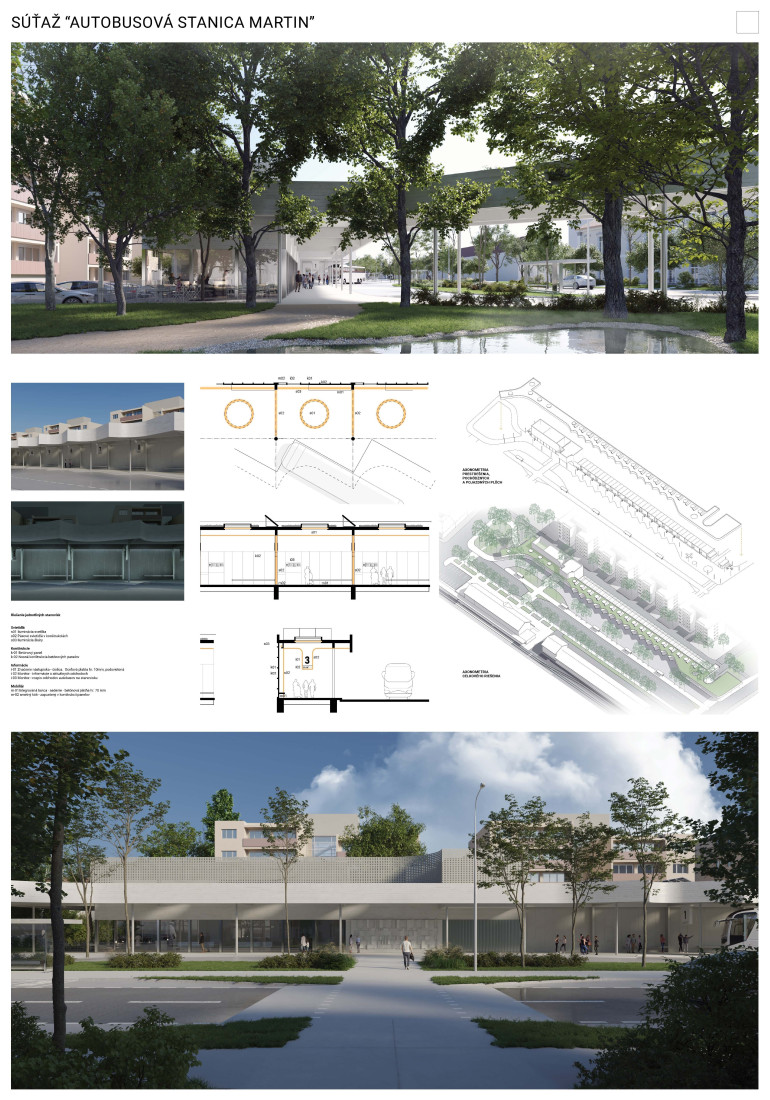 Architektonický návrh, založený na striktnom koncepčnom module. V návrhu boli identifikované predovšetkým prevádzkové a funkčné nedostatky/riziká, ktoré by znižovali komfort cestujúcich. Hoci autori priniesli racionálny konštrukčný systém uľahčujúci prefabrikáciu, jeho praktické uplatnenie v prostredí autobusovej stanice Martin naráža na limity. Pozitívne hodnotíme prehľadné dispozičné členenie a logické oddelenie čistých zón pre verejnosť od zázemia pre zamestnancov. Zásadným negatívom, ktoré návrh odsunulo na nižšiu priečku, je však príliš úzke a nedostatočné prestrešenie nástupíšť. V klimatických podmienkach Martina takéto riešenie neposkytuje adekvátnu ochranu pred zrážkami, najmä pri veternom počasí. Kritickým bodom je umiestnenie lavičiek a čakajúcich priestorov mimo hlavnej zóny prístrešku, čo zásadne znižuje užívateľský štandard. Použitie jemného bieleho plechu na pohľadových plochách pôsobí v návrhoch esteticky, no vyvoláva vážne obavy o náročnosť dlhodobej údržby. Zahrnutie fotovoltických panelov a vegetačnej strechy je v súlade s environmentálnymi požiadavkami, no v rámci súťaže ide o štandardné riešenie... Porota dospela k záveru, že investícia do takejto konštrukcie by nepriniesla potrebnú pridanú hodnotu v kľúčovom parametri „Komfort cestujúcich“.
