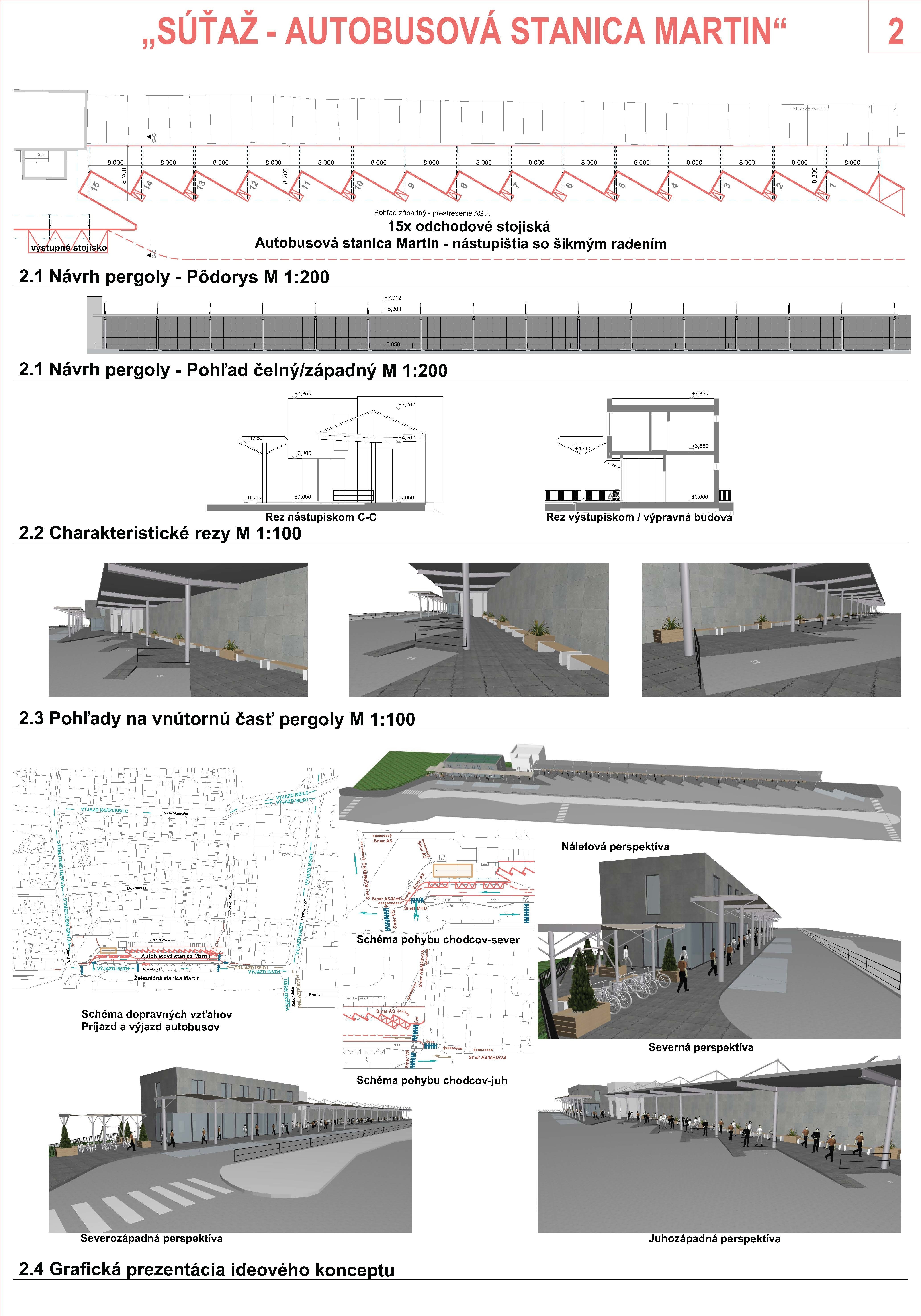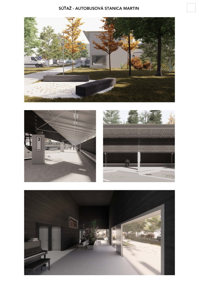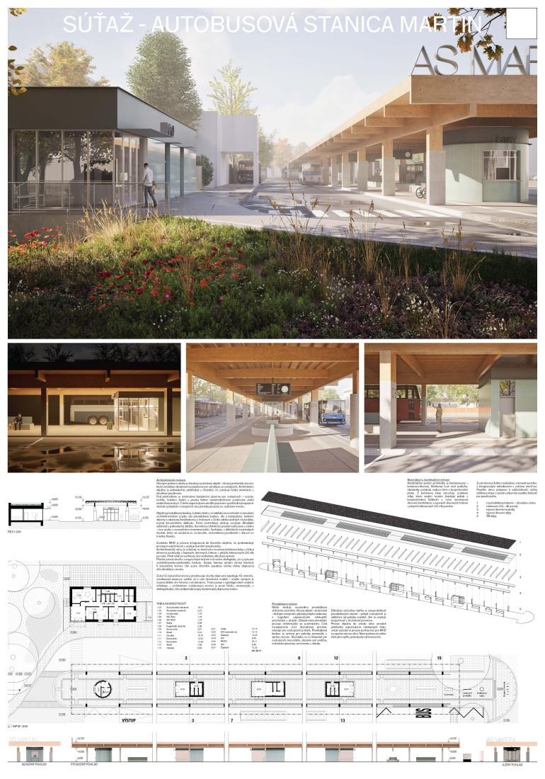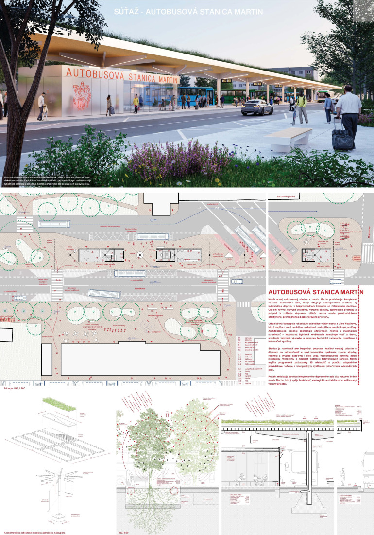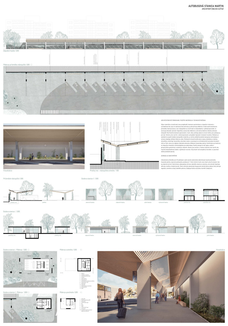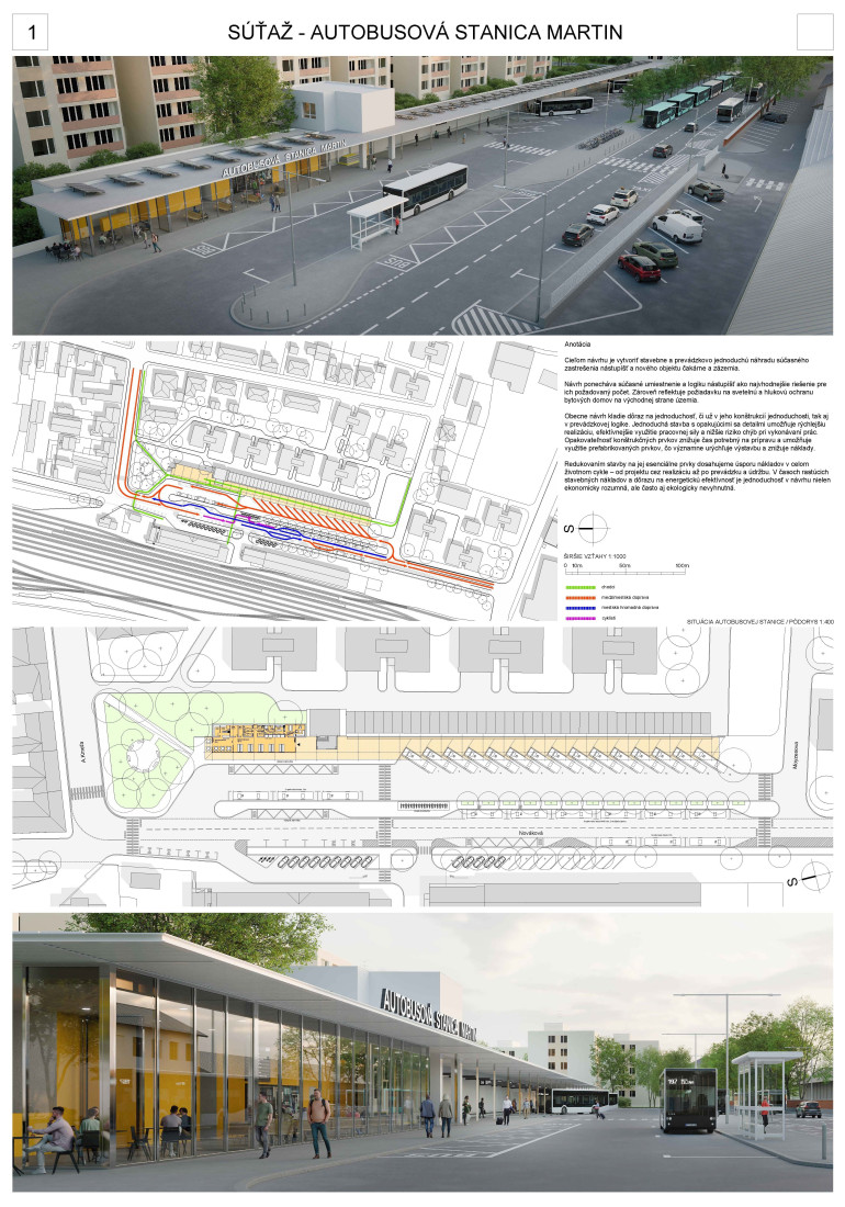 Kvalitný návrh s doriešenými urbanistickými väzbami na železničnú stanicu, s reprezentatívne pôsobiacou dvojpodlažnou prevádzkovou budovou, ktorá slúži ako akcent - jasný orientačný bod v priestore autobusovej stanice. Silnou stránkou návrhu je precízne spracovaná dopravná koncepcia, ktorá reorganizuje pohyb autobusov v území a vytvára plynulý a bezpečný prevádzkový systém. Predstavuje najkomplexnejšiu odpoveď na požiadavky súťažného zadania, pričom exceluje v urbanistickom scelení územia. Architektonický výraz budovy je moderný, sebavedomý, no zároveň rešpektuje mierku okolia a historický kontext železničnej stanice. Výrazné zastrešenie chráni cestujúcich a plynulo nadväzuje na prevádzkovú budovu, ktorá je funkčne a prehľadne riešená na dvoch podlažiach. Autorom sa podarilo vytvoriť plnohodnotný mestský terminál, ktorý integruje železničnú, diaľkovú, prímestskú a mestskú dopravu do jedného prehľadného celku. Interiér haly je presvetlený, prehľadný a ponúka vysoký štandard komfortu, ktorý Martin doteraz postrádal. Oceňujem použitie pergoly ako prepájacieho prvku, ktorý vizuálne aj funkčne sceľuje budovu stanice s nástupišťami do jedného harmonického celku. Implementácia zeleného mikroparku a vodozádržných opatrení dokazuje, že autori uvažovali o stanici ako o udržateľnom mestskom prvku. Systém navigácie je v návrhu integrovaný priamo do architektúry, čo zaručuje intuitívny pohyb aj pre návštevníkov, ktorí mesto nepoznajú.