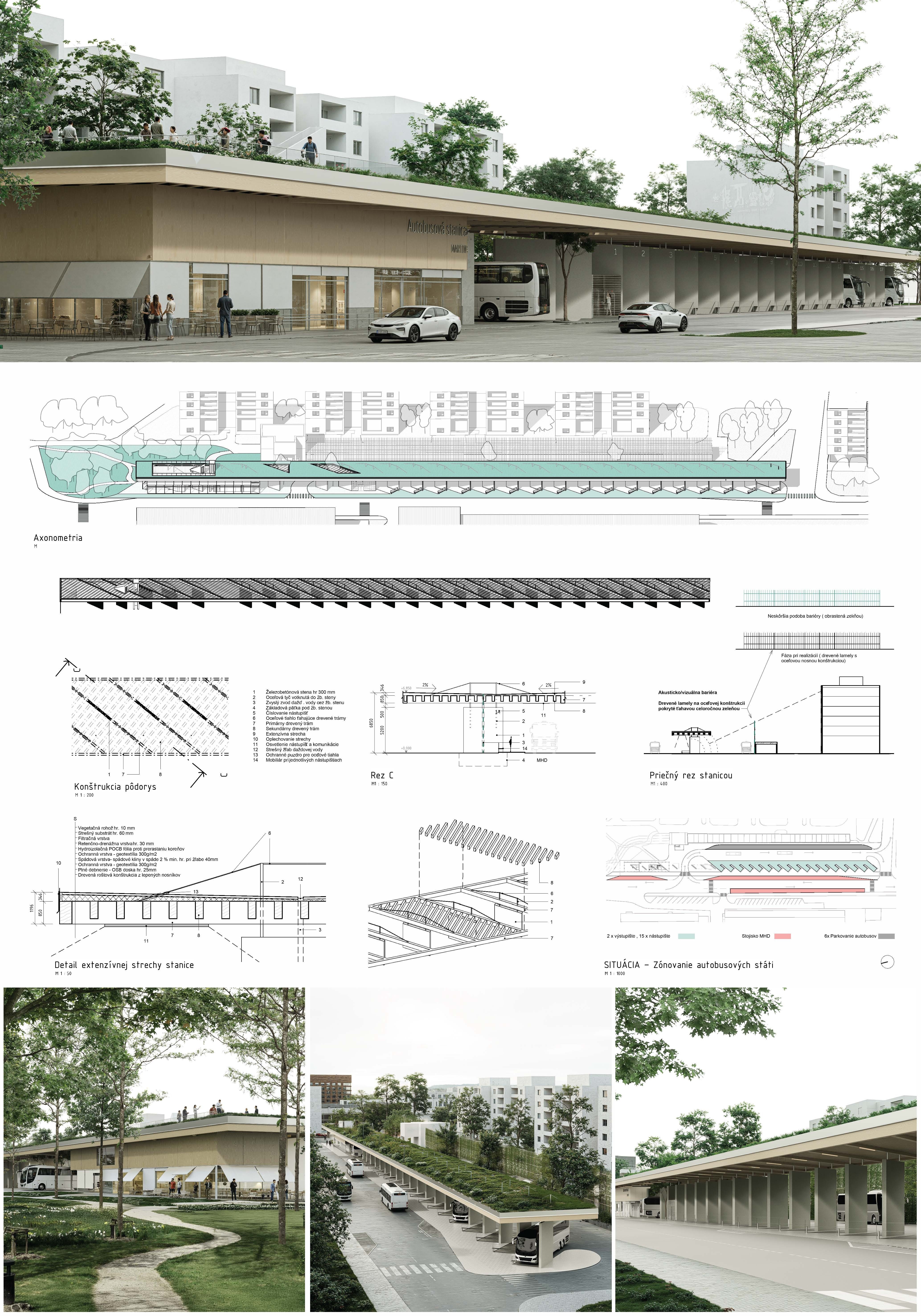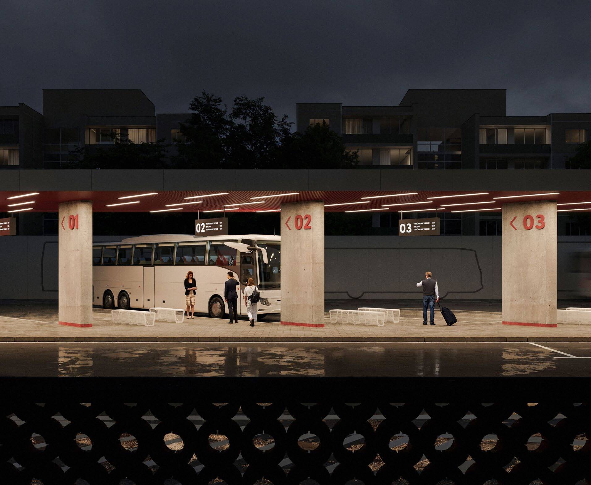 Nová autobusová stanica je umiestnená do stredu riešeného územia, kde tvorí jeho prirodzené centrum. Pohyb autobusov a cestujúcich je jasne oddelený, čo zvyšuje komfort aj bezpečnosť. Pod jednou strechou sa tu stretáva mestská, prímestská aj diaľková doprava. Budova má výrazne sochársky tvar so zvlnenou betónovou strechou, ktorá pôsobí ľahko a zároveň odkazuje na industriálnu minulosť mesta. Prevádzkové priestory sú riešené ako presklené moduly pozdĺž nástupíšť, ktoré sú praktické a dajú sa v budúcnosti upravovať. Zelená strecha zlepšuje klímu a hluk zo stanice je tlmený pomocou popínavých rastlín a stromov pozdĺž línie garáží. Návrh je funkčný, estetický a udržateľný. Použitý pohľadový betón pôsobí moderne, robustne a odolne voči poveternostným vplyvom.