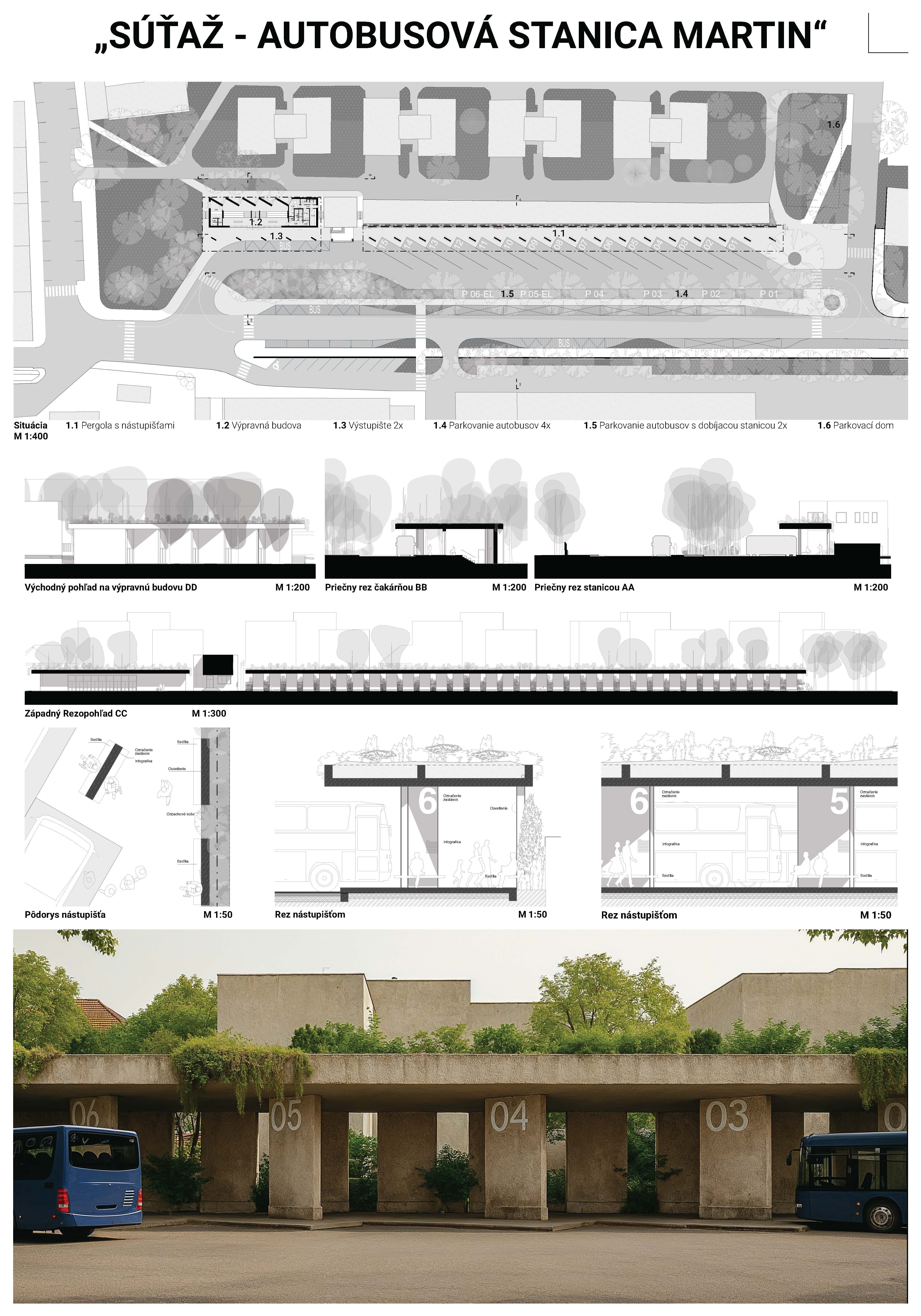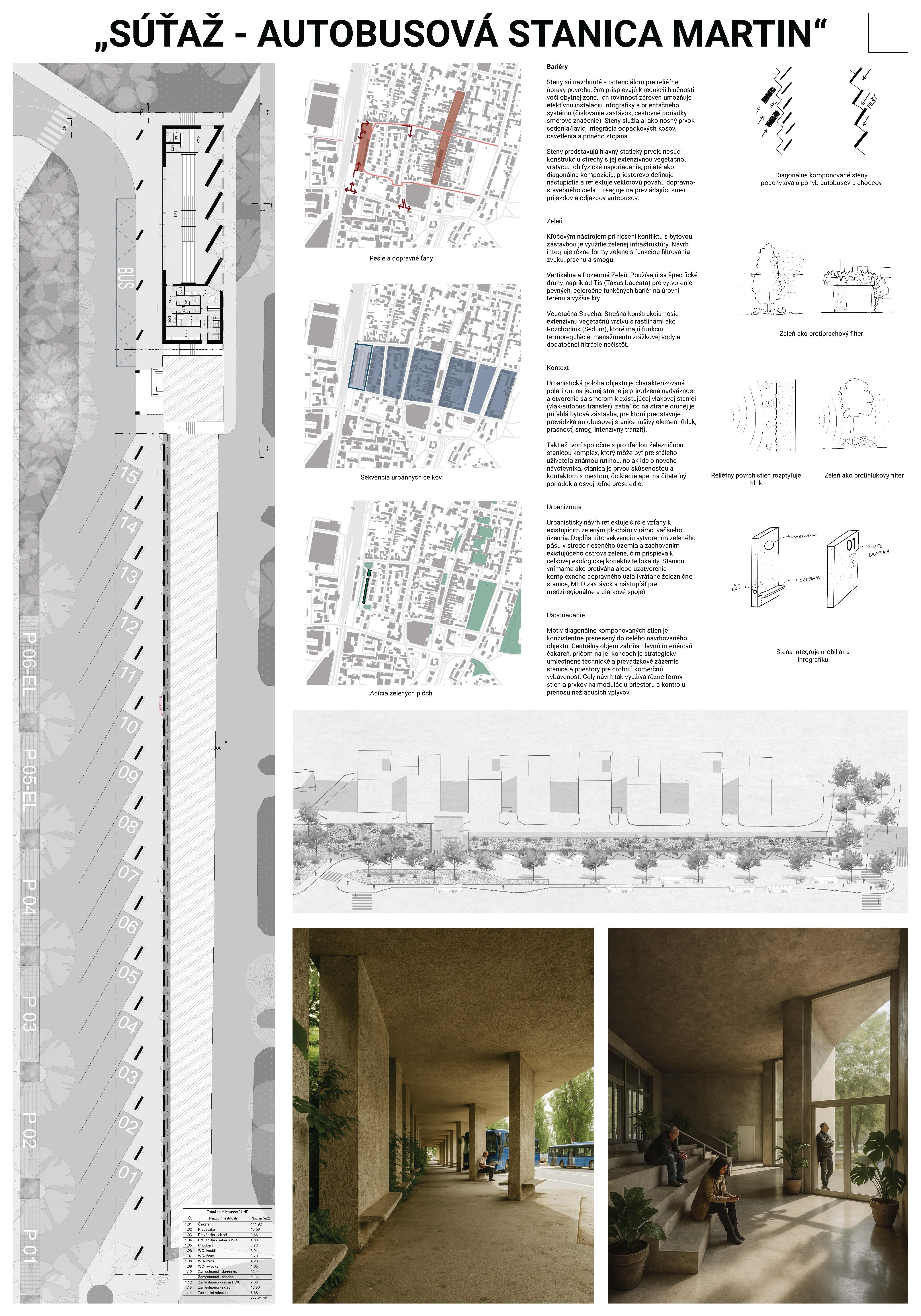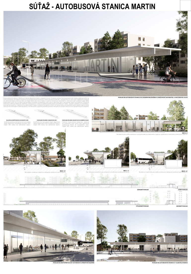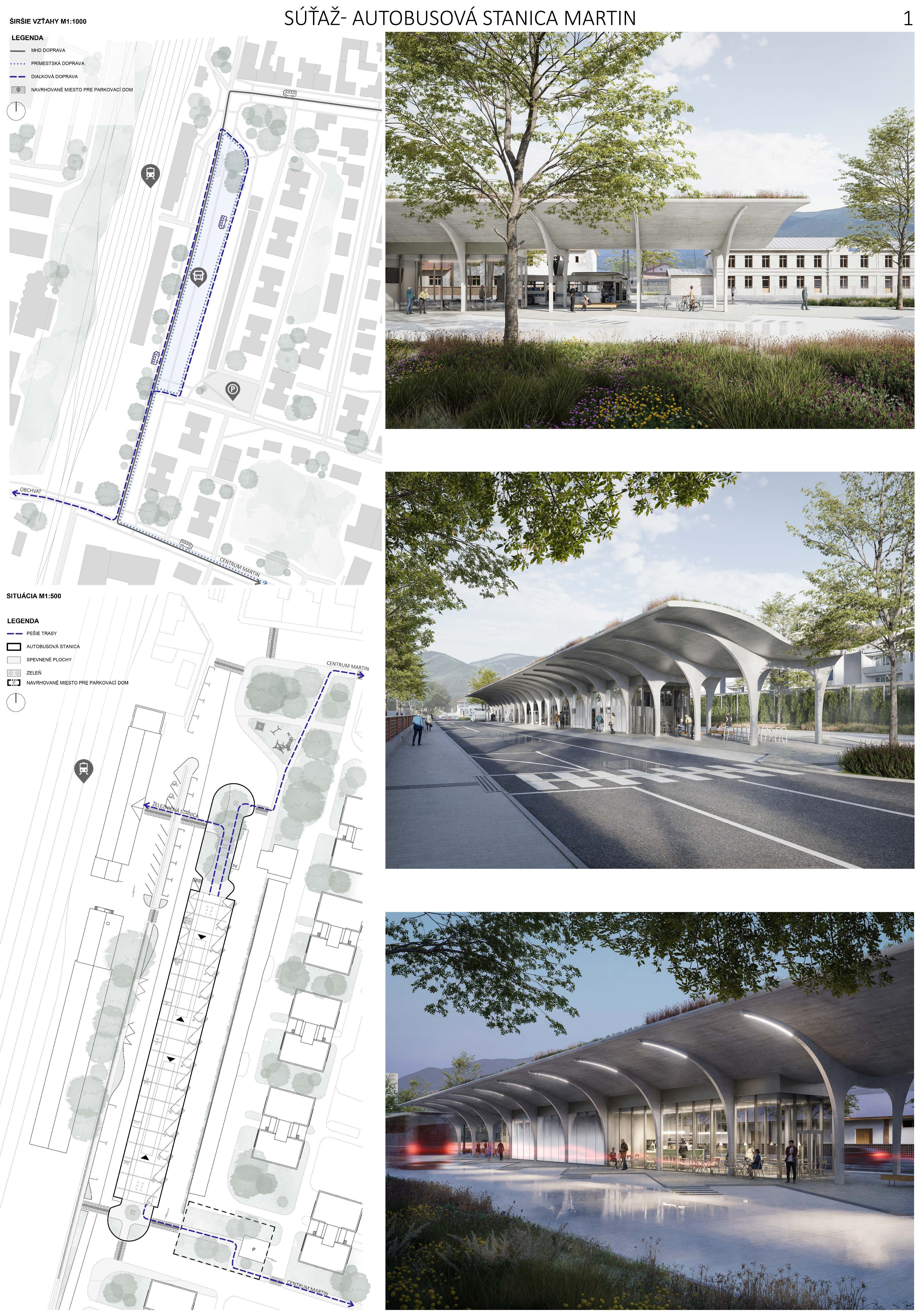 Návrh sa vyznačuje výrazne horizontálnym architektonickým výrazom, ktorý citlivo reaguje na mierku a charakter okolitej zástavby. V urbanistickom kontexte nepôsobí dominantne, ale prirodzene dopĺňa existujúcu štruktúru územia, čím podporuje jeho čitateľnosť a priestorovú kontinuitu. Prináša premyslenú dopravnú koncepciu s plynulou a bezpečnou prevádzkou pričom urbanisticky sprehľadňuje územie. Autobusová stanica je riešená ako centrálny ostrov s nástupišťami a pavilónmi, ktoré umožňujú dobrú orientáciu cestujúcich. V rámci dispozičného riešenia sú všetky hlavné funkcie – prevádzkové priestory pre vodičov diaľkových liniek, obchodný priestor - kaviareň aj čakáreň - situované v samostatných pozdĺžnych "pavilónoch", organizovaných pod jednou strechou na úrovni prízemia, pričom zostáva zachovaná možnosť priečneho aj pozdĺžneho pohybu peších. Na druhej strane obslužné priestory pre čakáreň a kaviareň sú príliš atomizované (rozptýlené), pričom ich proporcie komplikujú praktické využitie v reálnej prevádzke. Táto atomizácia má priamy negatívny dopad na stavebné náklady. Hoci lineárna kompozícia nástupíšť pôsobí esteticky, prevádzková réžia takto rozdrobeného zázemia je pre správcu menej efektívna. Figúra stanice s lightboxami a nápisom „MARTIN“ je kvalitná, no nepreváži funkčné limity úzkych vnútorných priestorov.