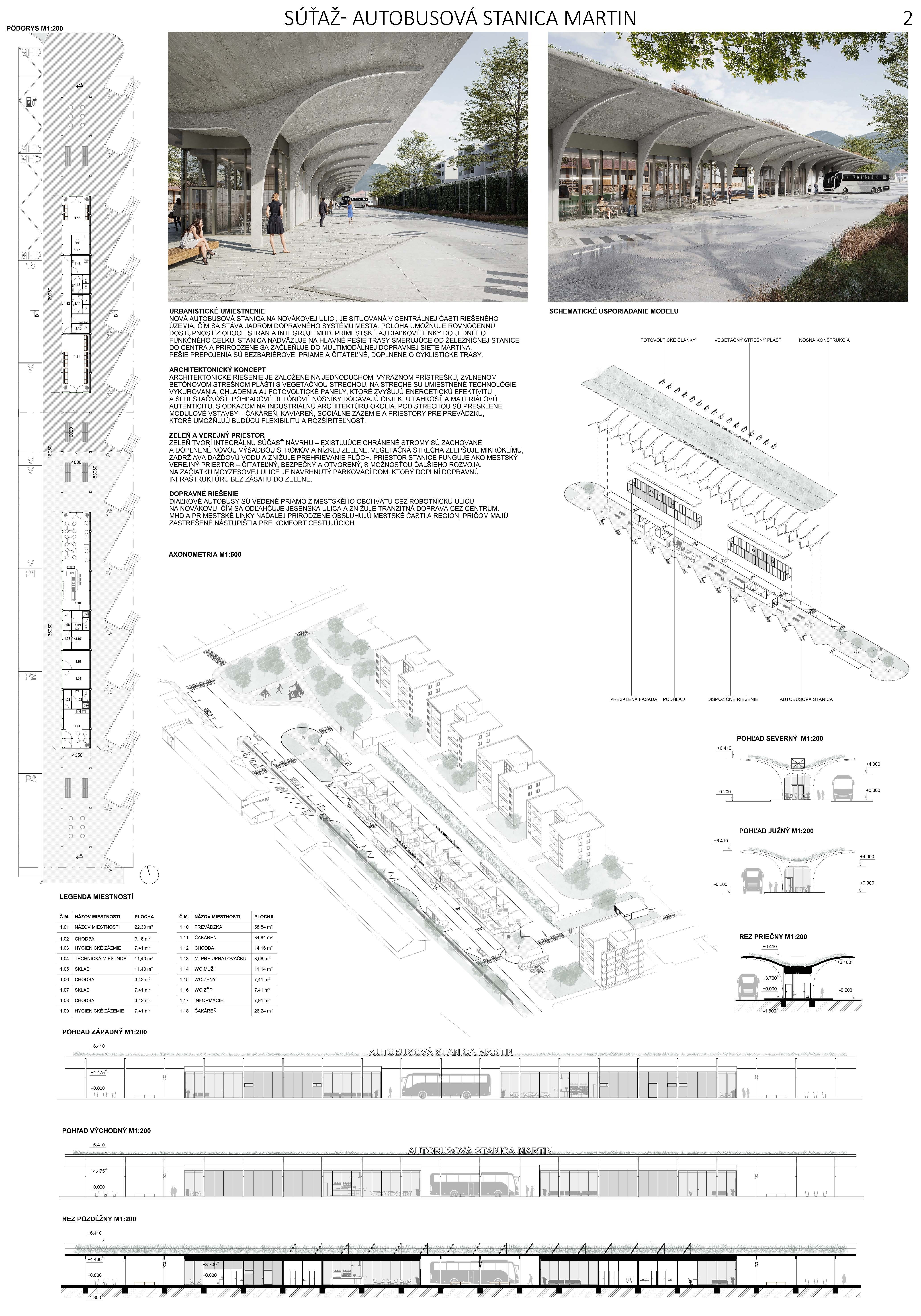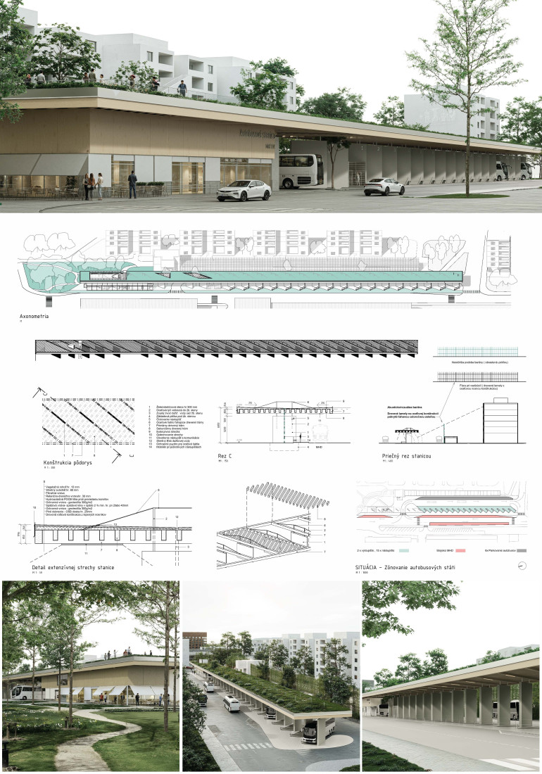 Architektonický návrh, založený na striktnom koncepčnom module. V návrhu boli identifikované predovšetkým prevádzkové a funkčné nedostatky/riziká, ktoré by znižovali komfort cestujúcich. Hoci autori priniesli racionálny konštrukčný systém uľahčujúci prefabrikáciu, jeho praktické uplatnenie v prostredí autobusovej stanice Martin naráža na limity. Pozitívne hodnotíme prehľadné dispozičné členenie a logické oddelenie čistých zón pre verejnosť od zázemia pre zamestnancov. Zásadným negatívom, ktoré návrh odsunulo na nižšiu priečku, je však príliš úzke a nedostatočné prestrešenie nástupíšť. V klimatických podmienkach Martina takéto riešenie neposkytuje adekvátnu ochranu pred zrážkami, najmä pri veternom počasí. Kritickým bodom je umiestnenie lavičiek a čakajúcich priestorov mimo hlavnej zóny prístrešku, čo zásadne znižuje užívateľský štandard. Použitie jemného bieleho plechu na pohľadových plochách pôsobí v návrhoch esteticky, no vyvoláva vážne obavy o náročnosť dlhodobej údržby. Zahrnutie fotovoltických panelov a vegetačnej strechy je v súlade s environmentálnymi požiadavkami, no v rámci súťaže ide o štandardné riešenie... Porota dospela k záveru, že investícia do takejto konštrukcie by nepriniesla potrebnú pridanú hodnotu v kľúčovom parametri „Komfort cestujúcich“.