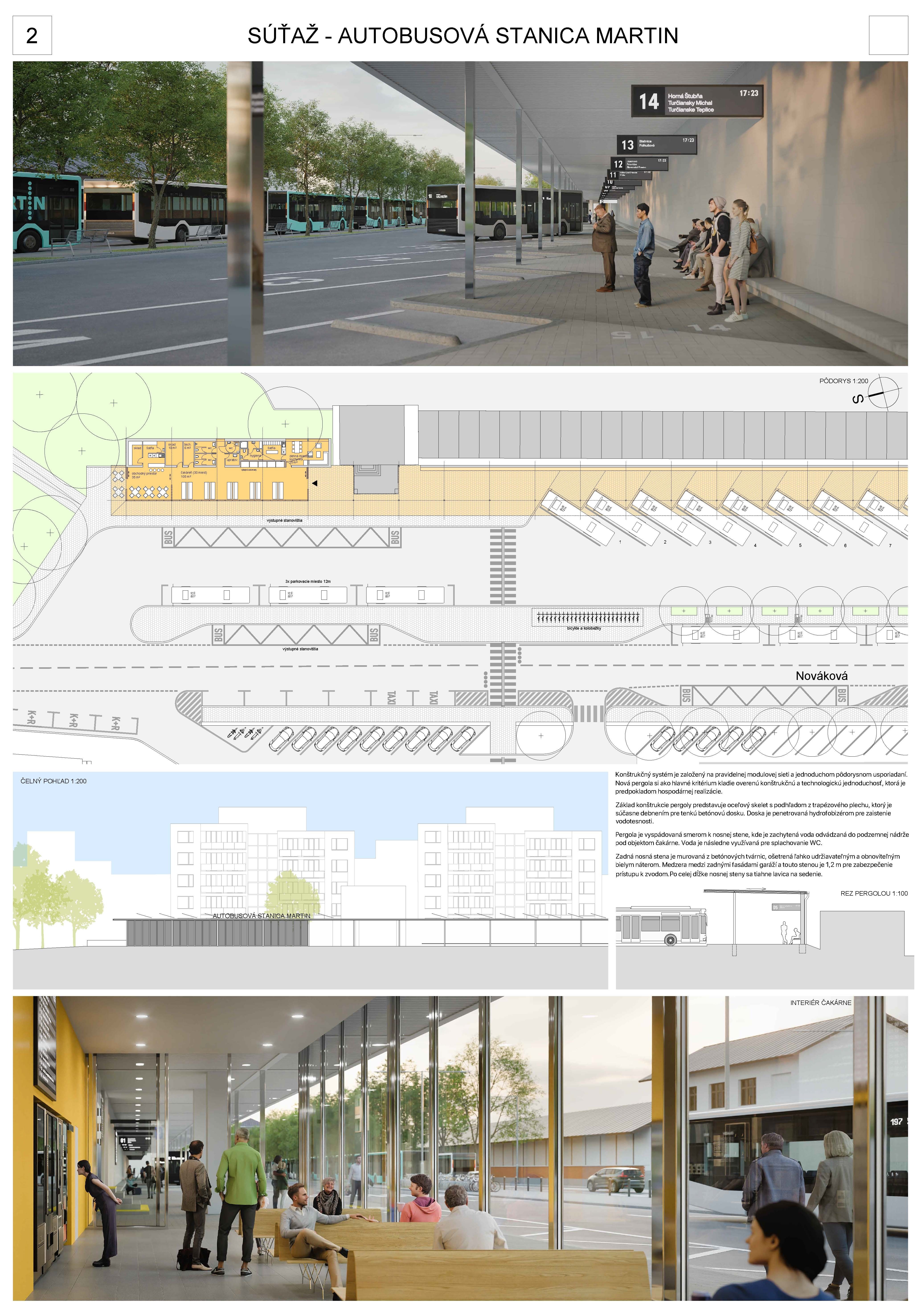 Kvalitný návrh s doriešenými urbanistickými väzbami na železničnú stanicu, s reprezentatívne pôsobiacou dvojpodlažnou prevádzkovou budovou, ktorá slúži ako akcent - jasný orientačný bod v priestore autobusovej stanice. Silnou stránkou návrhu je precízne spracovaná dopravná koncepcia, ktorá reorganizuje pohyb autobusov v území a vytvára plynulý a bezpečný prevádzkový systém. Predstavuje najkomplexnejšiu odpoveď na požiadavky súťažného zadania, pričom exceluje v urbanistickom scelení územia. Architektonický výraz budovy je moderný, sebavedomý, no zároveň rešpektuje mierku okolia a historický kontext železničnej stanice. Výrazné zastrešenie chráni cestujúcich a plynulo nadväzuje na prevádzkovú budovu, ktorá je funkčne a prehľadne riešená na dvoch podlažiach. Autorom sa podarilo vytvoriť plnohodnotný mestský terminál, ktorý integruje železničnú, diaľkovú, prímestskú a mestskú dopravu do jedného prehľadného celku. Interiér haly je presvetlený, prehľadný a ponúka vysoký štandard komfortu, ktorý Martin doteraz postrádal. Oceňujem použitie pergoly ako prepájacieho prvku, ktorý vizuálne aj funkčne sceľuje budovu stanice s nástupišťami do jedného harmonického celku. Implementácia zeleného mikroparku a vodozádržných opatrení dokazuje, že autori uvažovali o stanici ako o udržateľnom mestskom prvku. Systém navigácie je v návrhu integrovaný priamo do architektúry, čo zaručuje intuitívny pohyb aj pre návštevníkov, ktorí mesto nepoznajú.